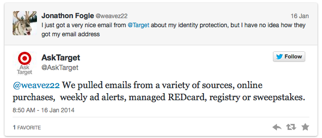 Yet Target's not doing itself any favors in the aftermath of the latest attack, either. In an effort to soothe potentially affected consumers, it sent out an email offering a year of free Experian credit monitoring, only it used some weird third-party service to send out the notice so that numerous recipients began wondering if it was part of a phishing scam that was following up the hack attack. Twitter users immediately raised yellow flags about the move.