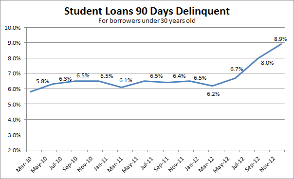 Younger students and recent grads under 30 years old are among the hardest hit. The percentage of loans 90 days delinquent or more rocketed to 8.9%, up from 6.5% just one year earlier.