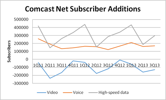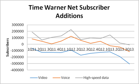 That's not a pretty picture. Time Warner hasn't added video subscribers in more than a dozen quarters. But even the once-strong high-speed data segment has dropped to new lows recently. What's driving customers away from Time Warner?