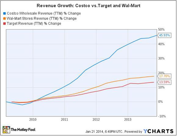 Costco has materially outperformed competitors such as Wal-Mart (WMT +0.91%) and Target (TGT +2.34%) over the past few years. This is an important consideration when making investment decisions in an industry like discount retail, in which one company's gains are usually another one's losses.