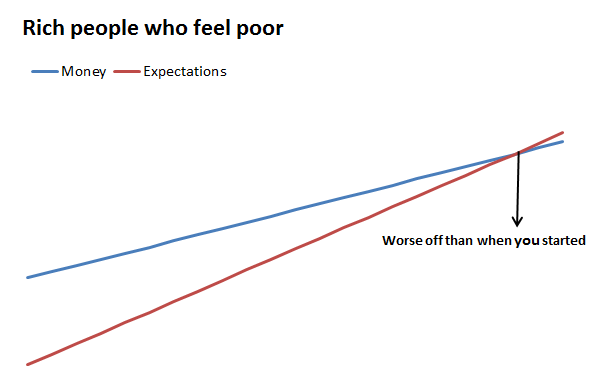 I've seen this firsthand. During college I worked as a valet at a private country club. The clientele had more money than I could dream of, with private jets, yachts, and Lamborghinis. But the more I worked with them, the more I realized they were some of the most unhappy, uptight, stressed, and unsatisfied people I had ever met. Part of this is because they were Type-A personalities who couldn't slow down. But part of it was because for every dollar of wealth they gained, they moved the goalpost of success two dollars down the field. The only thing that grew faster than their bank accounts was their burning desire for another house, another car, and another boat. Anyone in that situation won't feel rich, regardless of how much money they have. It's worse than running in circles. It's running backward, 60 to 80 hours a week. A person who makes $50,000 a year but only needs $30,000 to be happy is much richer than the person who makes $1 million but needs $1.1 million. This seems obvious, but it's shocking how many people ignore their expectations when trying to improve their financial lives.