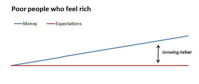 This doesn't mean everyone should learn how to be happy sleeping in a tent and living off cat food. I don't want to live like a monk. But regardless of how much money you think you'll need to be happy, the key to feeling rich and staying rich is allowing your money to grow at the same rate as -- or faster than -- your desire to spend it. The people who feel the richest have a relationship with money that looks like this: