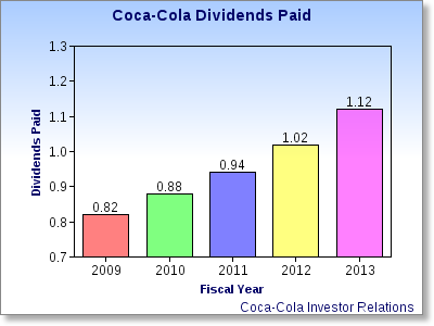 Coca-Cola has grown its dividend by roughly 36.6% since 2009 and I believe the dividend could continue to grow at this rate, regardless of the price action in the stock; this opinion is supported by the fact that so many of Coca-Cola's products fall under the category of "cash cows" and those alone could keep the company and its dividend growing for decades. The initiation of a position in this stock right now would provide a consistent and growing stream of income to any portfolio.