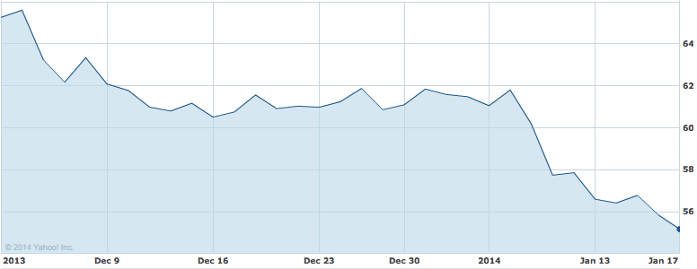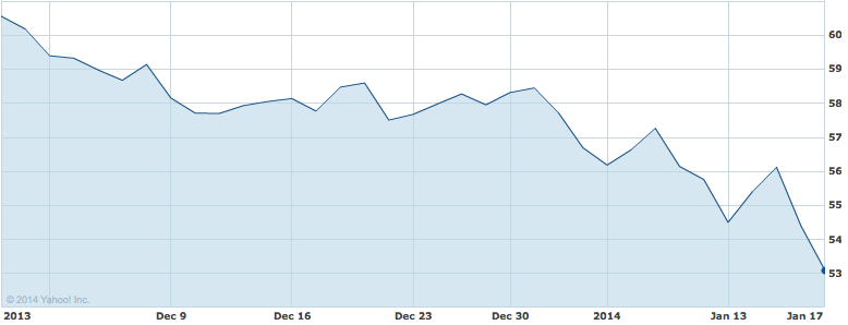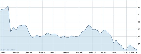 The stock has been on downward slope since reaching its 52-week high of $60.98 on Nov. 27. The decline has happened for no legitimate reason; there have not been any earnings released, major downgrades of the stock, decreased outlook, secondary offerings, or insider selling, so it appears that investors are simply taking profits. There has, however, been a recent report alleging that vitamins and supplements have no true benefits, but I do not believe this will stop Americans from continuing to buy them; if this gains more traction and there is more of a public outcry, then I would revisit the allegations and take it more seriously.