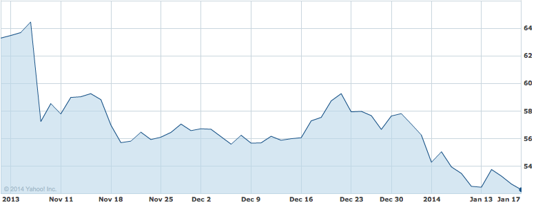 Today, the stock sits at more than 20% below its 52-week high of $65.59 reached on Oct. 28. The mixed report was acceptable and the reduced outlook was minimal, so a large sell-off of 20% is a bit extreme. I believe Whole Foods will continue its expansion efforts and deliver on the reduced earnings in 2014, slowly driving its shares toward its 52-week high. If this happens, investors would accumulate a solid return of roughly 25.4%, which I believe will far outperform the overall market.