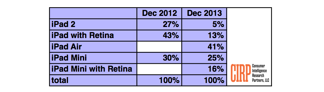 Consumer Intelligence Research Partners released analysis from its research on Apple (AAPL +0.38%) for the last calendar quarter of 2013. The analysis features the first findings about consumer trends for U.S. sales of the new iPad Air and Retina iPad Mini models, which launched in November 2013.