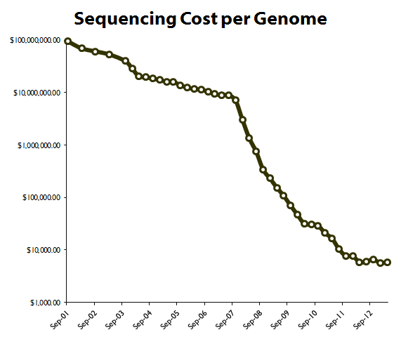 It stands to reason that a process that becomes cost-competitive with many other standard medical screenings ought to become a standard screening itself. There are obstacles that must be overcome before that can happen, which I covered two years ago, but none of them are insurmountable. Indeed, plunging sequencing costs are likely to give rise to a robust genomic-analysis industry built to minimize the time between sequencing the genome and understanding it. Our scientific understanding of the genome is presently somewhere closer to the accidental discovery of penicillin than it is to understanding its effect on the body and producing it in commercial quantities, which is why low-cost genome sequencing is so important -- our understanding will grow as our data improves, and more genomes from more people will be the best raw data science can get.