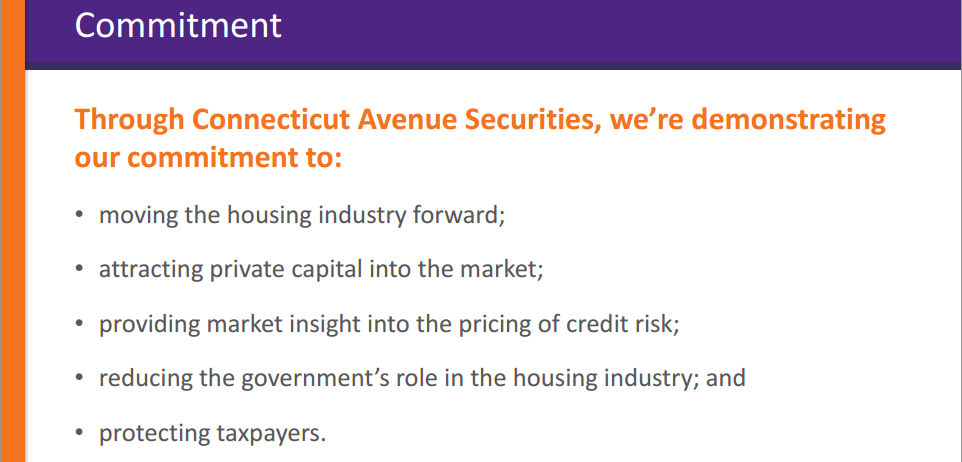 In the investor presentation on the C-deals transaction, Fannie Mae notes that it has five commitments, none of which relate to its investors: