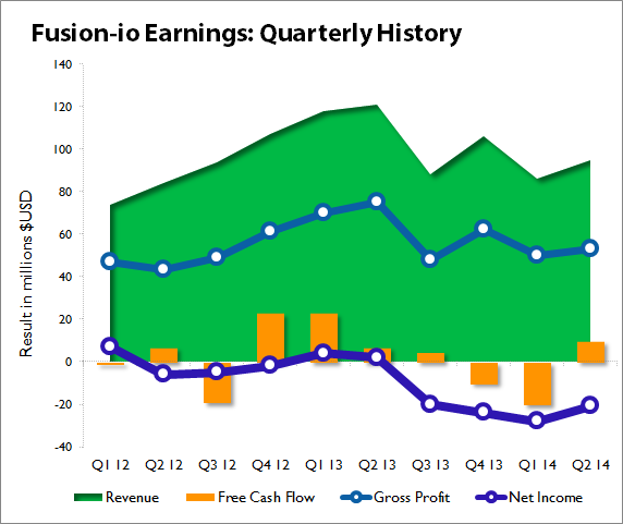 Fusion-io beat expectations on both top and bottom lines: Wall Street's $0.10-loss-per-share consensus was trounced by a comparatively "strong" $0.06 loss per share, thanks to stronger-than-expected revenue of $94.5 million (against an $89.1 million consensus). However, the company expects revenue to be flat to "slightly up" in the third quarter, and anticipates a rather ugly non-GAAP operating loss of 15% to 20% of revenues. Based on available information (we'll give Fusion-io the benefit of the doubt and tack on $3 million in additional revenue for the upcoming quarter), that works out to an 11% year-over-year improvement in revenue, but net losses may wind up coming in worse than the year-ago quarter's GAAP loss of $20 million after non-operating expenses are taken into account.