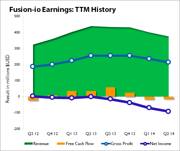 Here's what Fusion-io's recent results look like on both a quarterly and a trailing-12-month basis. As you can see, the company's "transformation" -- as CEO Shane Robinson called it in the after-hours earnings call yesterday -- has not produced the desired results just yet: