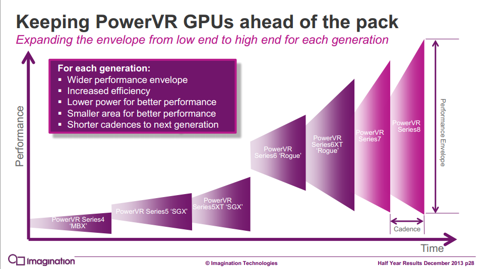 Apple, which actually owns a roughly 10% stake in the IP company, has frequently been an early adopter of Imagination's PowerVR designs. This has allowed Apple to routinely launch phones and tablets with bleeding-edge graphics performance well before many of its competitors. Further, at Imagination's most recent earnings call, management pointed out that the company would be moving faster in developing new iterations of its GPU IP: