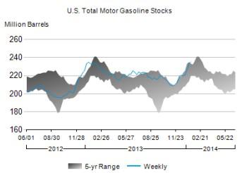 Gasoline inventories added on 2.1 million barrels (0.9%) for the fourth straight week of expansions. Demand for motor gasoline over the last four-week period is down a seasonally adjusted 0.1% from the same period last year. In the last year, supplies have expanded a slight 0.9%.