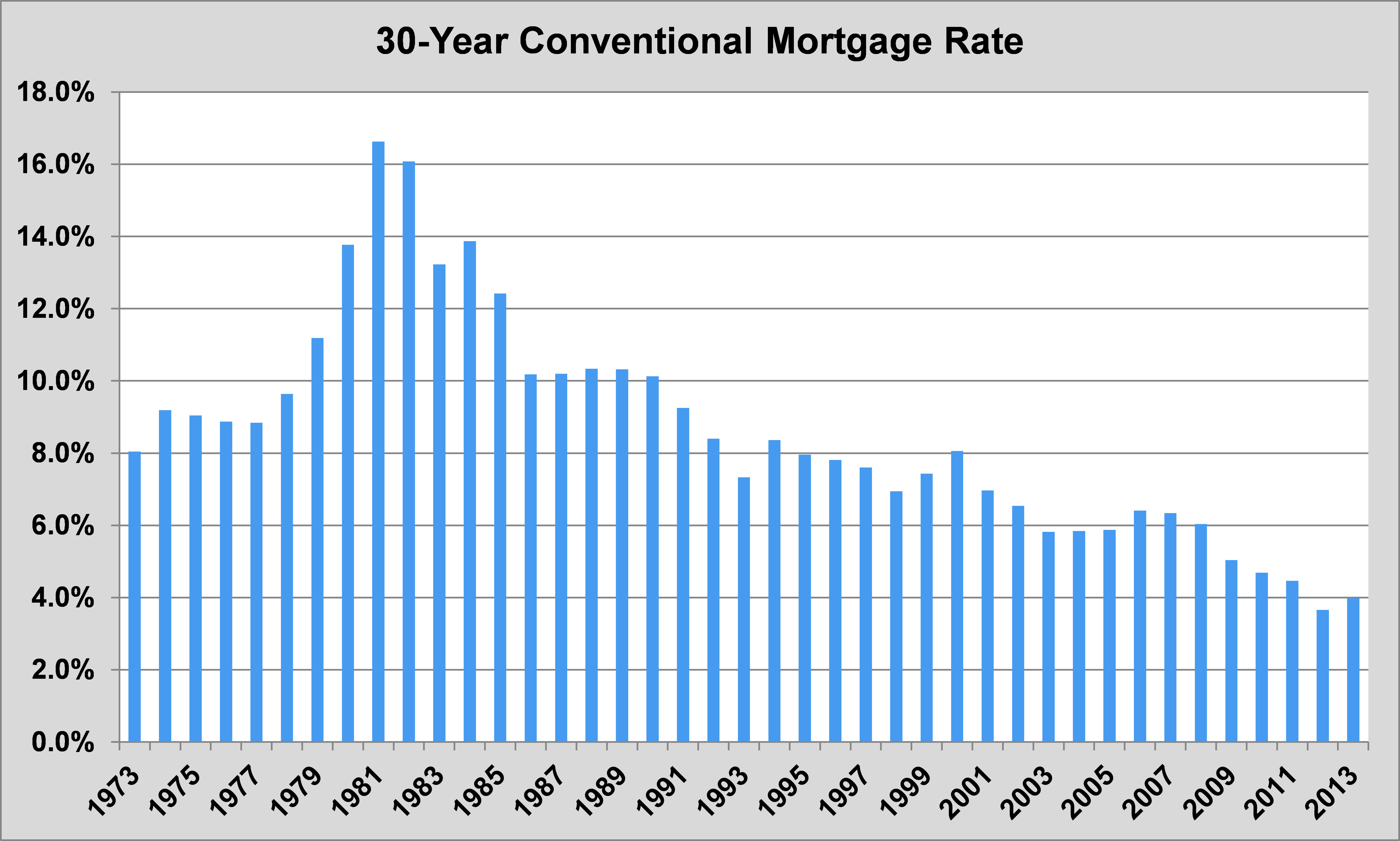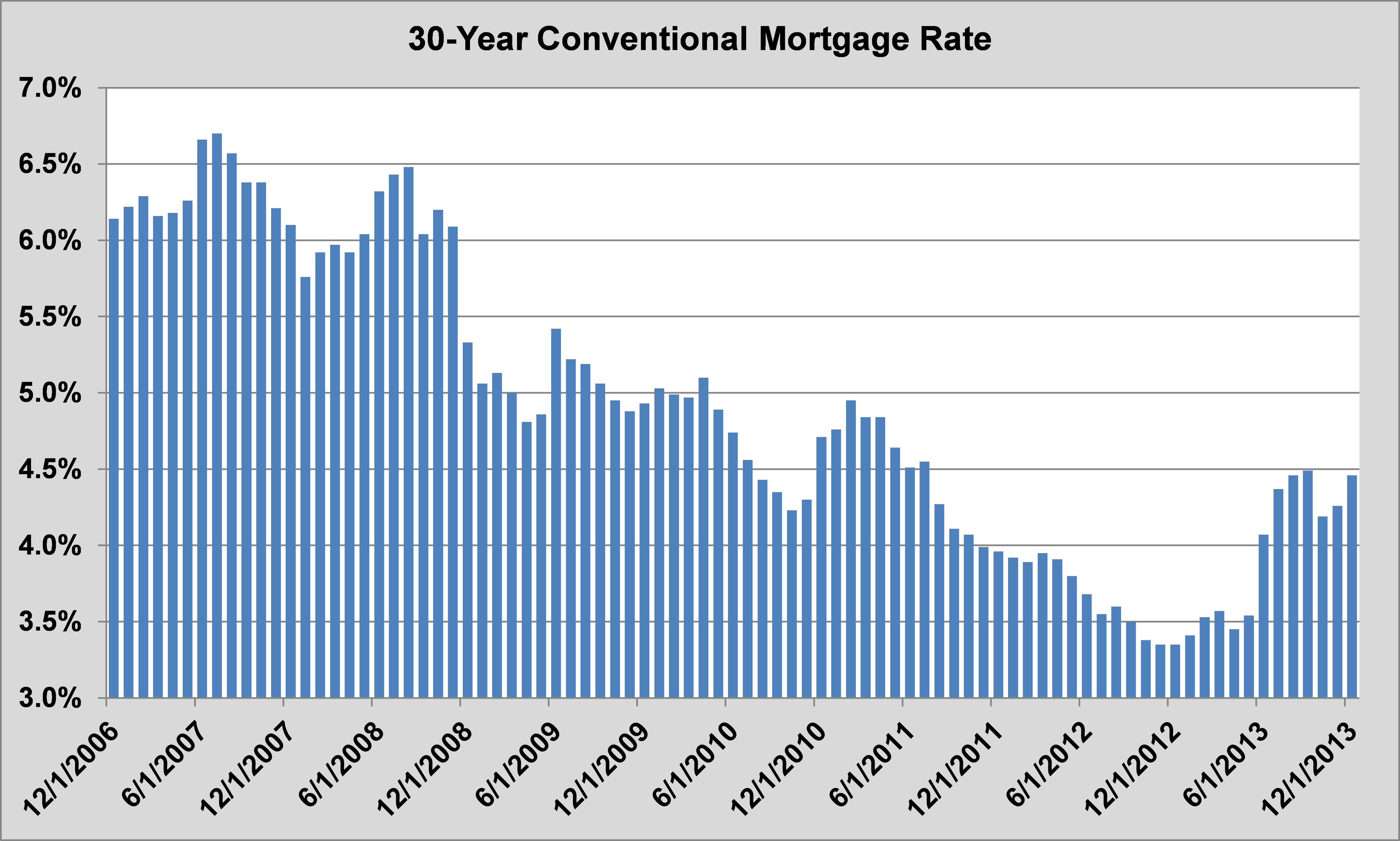Following the financial crisis, mortgage rates steadily inched further and further downward, hitting a low of 3.4% in December 2012. Yet the following 12 months were a different story as rates rose considerably, and in December 2013 the average for 30-year fixed-rate mortgages stood at 4.5%: