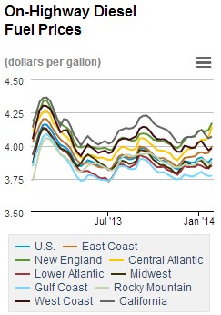 While gas prices stayed relatively steady, diesel prices increased $0.031 over the past week to $3.904 per gallon. Despite the increase, this latest price tag still puts diesel $0.023 per gallon below the same time last year. East Coast prices made a large $0.05 move up, while Gulf Coast prices barely budged, adding just $0.001.