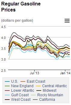The national average price for regular gasoline clocked in at $3.295 per gallon today, a slight $0.001 below a week ago and $0.062 below the same time last year. East Coast prices helped keep prices down with a $0.012 dip, while the Midwest was the only region to raise prices, up $0.019.