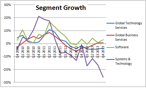 A chart of IBM's segmental revenue growth reveals how lackluster its growth was in 2013.