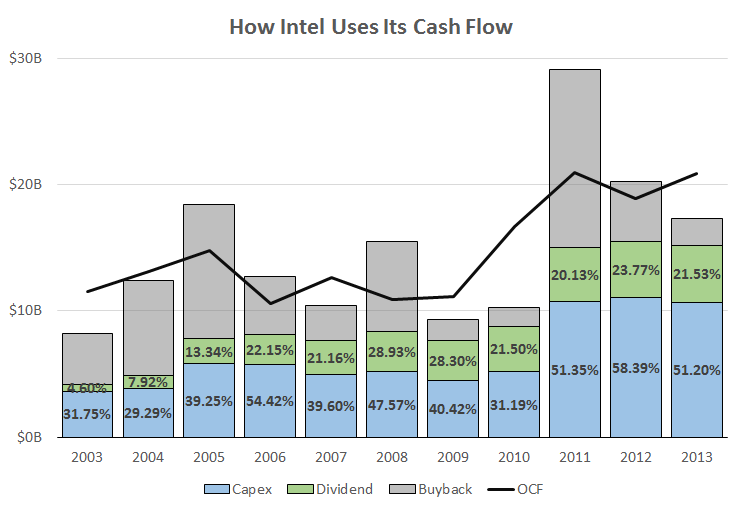 The decline of the PC market, along with Intel's sluggish entry into the mobile market, has left operating cash flow at a standstill even as capital expenditures have shot through the roof. The payoff for Intel is just beginning, with the company targeting a quadrupling of its mobile chip sales this year, but it will be at least a few years before the division starts to turn a profit. Currently, the mobile-chip division is losing about $2.5 billion per year in operating income, and that may rise in 2014 as Intel offers incentives to OEMs in order to push adoption of its mobile chips.