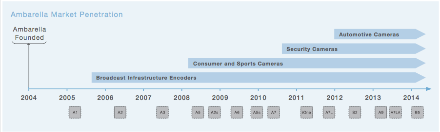 In addition, the company produces television broadcast encoding\decoding chips. With high-definition displays becoming common place, Ambarella has a bright future ahead of it. Founded in 2004, the company started in the broadcast infrastructure market, then brought the technology to consumer, sport, security, and automotive camera markets. Here is a graph of the Ambarella timeline: