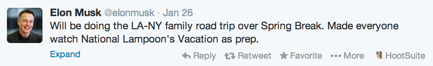 With this latest completion, coast-to-coast Model S travel is now a reality. Two Model S owners were the first to complete a cross-country drive using only the superchargers, according to PlugShare. Meanwhile, two groups from Tesla will attempt to set speed records driving across the U.S. later this week. Musk is also planning to get in on the Supercharger action, with plans for a cross-country trip with his family over spring break -- perhaps he'll be driving Tesla's upcoming Model X crossover.