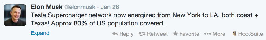 Tesla Motors (TSLA 1.10%) passed a fresh milestone this week, after the electric-car maker officially connected its East Coast and West Coast Supercharger network. This will allow Model S drivers to travel virtually for free across the U.S. without ever using a drop of gas. Tesla's CEO, Elon Musk, wasn't shy about sharing the news. Yesterday he tweeted that approximately 80% of the U.S. population is now within range of a Supercharger station.