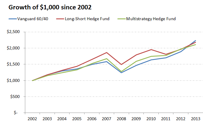 The results are actually worse than I'm showing here, because the hedge fund returns in this chart are from an index comprising hundreds of funds, which no one can actually invest in. The actual experience of investors in individual hedge funds is more volatile than this chart shows, with some funds doing better and others much worse.