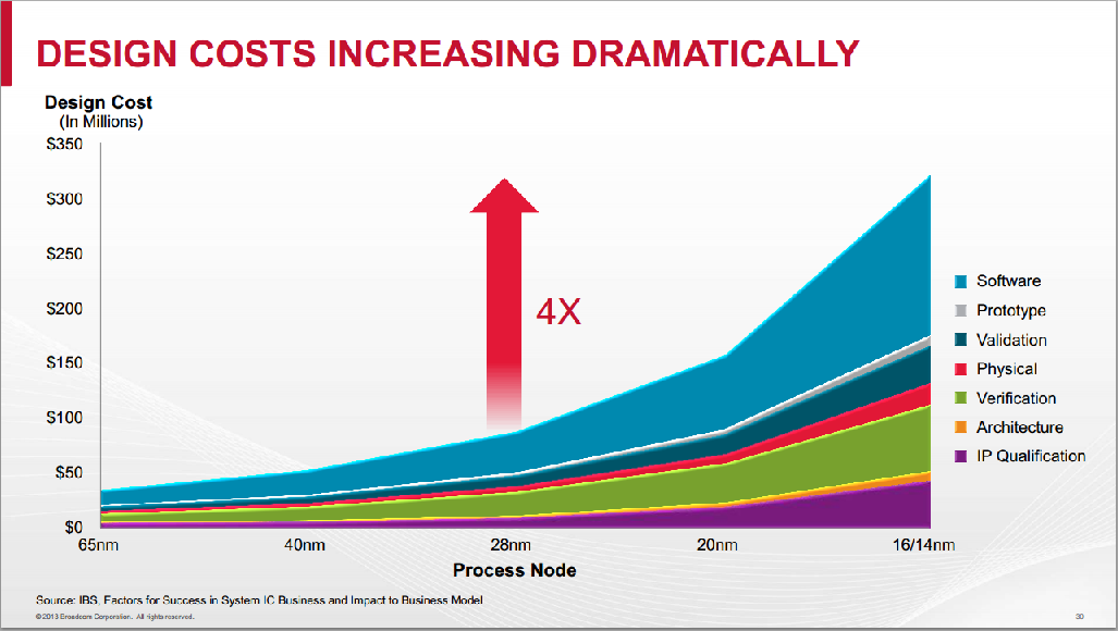 After years of these great cost/transistor improvements generation after generation, the fabless semiconductor companies have begun to complain that cost/transistor is beginning to head (perhaps violently) in the wrong direction. Here's Broadcom's (a leading fabless semiconductor company) take on the matter: