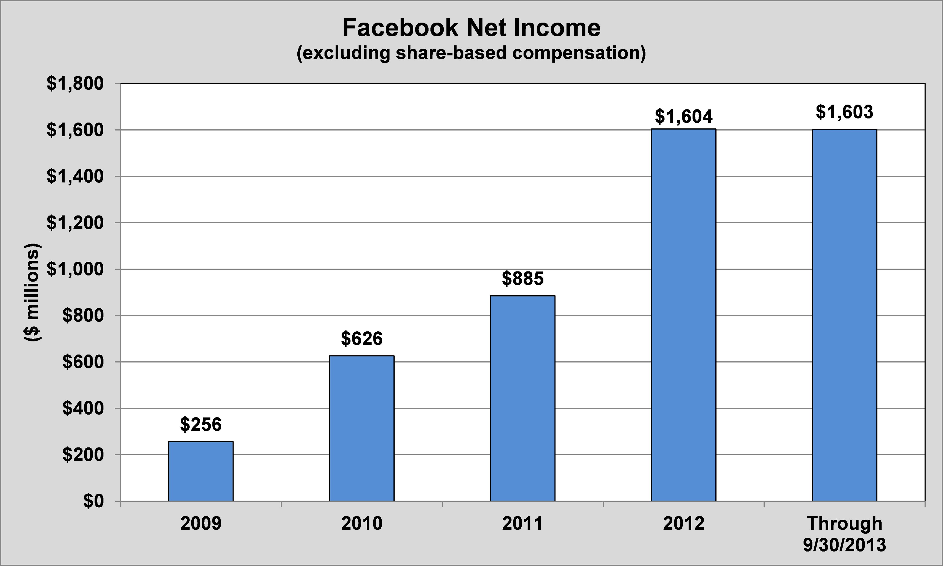 Facebook, on the other hand, tells a different story. If you exclude for share-based compensation, it has done a rather impressive job at growing its income: