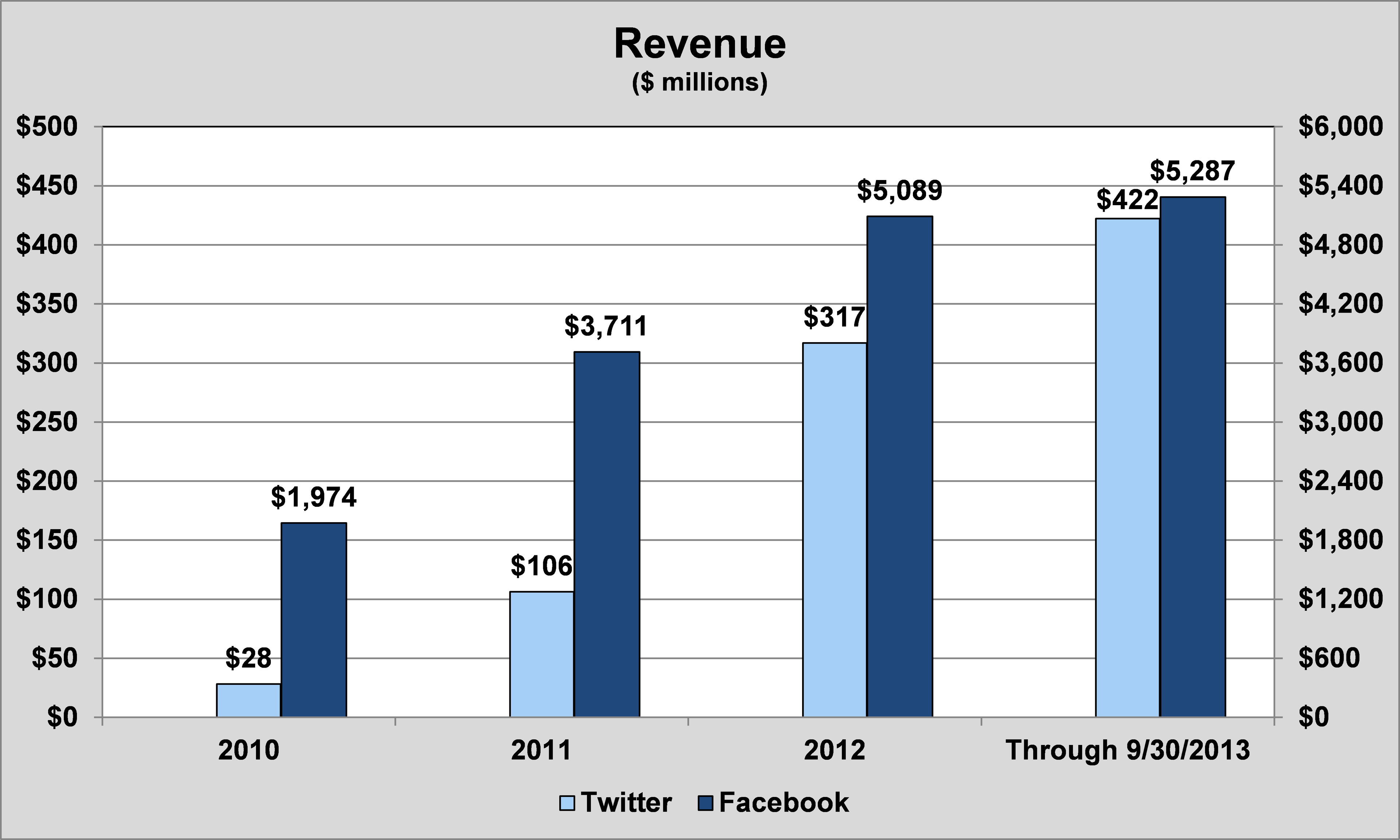 The two companies have been growing revenue at remarkable levels. Through the first nine months of 2013, Twitter's revenue grew at an annualized rate of 167%. Facebook's growth was as equally impressive for a company that was already so large, standing at 43%: