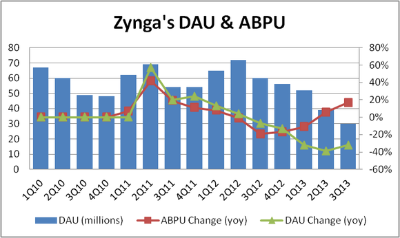 Zynga's reliance on in-game purchases makes the average bookings per daily user, or ABPU, a key metric for the company's overall health. And ABPU has shown improvements over the past few quarters.