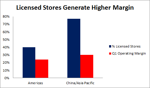 Licensed stores increase Starbucks' operating margin because the royalties fall straight to the bottom line. The Americas division is 60% company-operated stores and 40% licensed stores; it generates a 24% operating margin. On the other hand, 77% of locations in the China-Asia Pacific region are licensed stores; the segment earns an operating profit in excess of 30%.