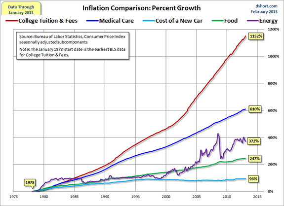 Today, 71% of all college graduates enter the workforce with a debt load that averages $29,400. This number is somewhat skewed by the extreme debt loads taken on by students at private colleges, but the median student loan debt is still $12,800. Unfortunately, employment dynamics have not been kind to recent graduates, who remain unemployed at higher rates and have fewer opportunities to land a good job when they do become employed. Only 39% of all student loan borrowers are currently paying off their loans and are not delinquent in the effort. Millions of Americans who are worried about the costs of college aren't wrong, because these costs have risen far more than any other major expense over the past three-plus decades, including the medical costs Obamacare hopes to rein in: