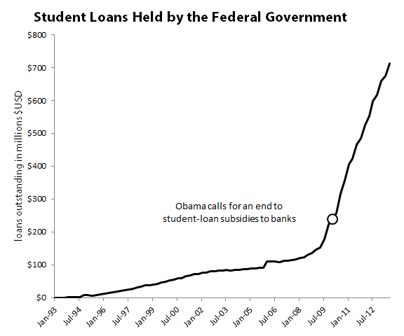 In his first State of the Union in 2009 (actually just an address to Congress delivered shortly after his inauguration), Obama said, "We have made college affordable for nearly 7 million more students" and asked "every American to commit to at least one year or more of higher education or career training." A year later, in his first true State of the Union, Obama pushed to end taxpayer subsidies to banks for student loans, which advanced the already accelerating trend toward federal responsibility for student-loan financing. Since then, student loans, which were already growing fast on the government's balance sheet, have exploded: