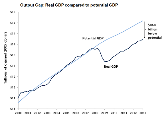 When examining the economy, we tend to say that we exited a recession in 2009, because that's when most measures of economic productivity began to turn upward again. But it doesn't feel like much of a recovery because, five years later, the national economy still hasn't gotten back to the level of productivity it could have achieved. We call that the "output gap," and last year the difference between real and potential GDP amounted to almost $1 trillion: