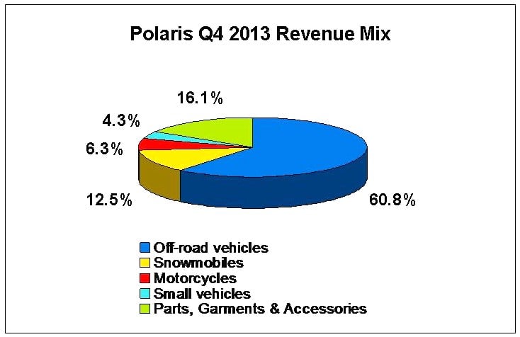Polaris' Indian motorcycle sales helped power the company's motorcycle revenue up 94%. While motorcycle sales -- which include the Indian and Victory lines -- comprise a small portion of Polaris' revenue, they're much more important than their percentage of revenue would suggest. In August, the company launched three 2014 Indian models, which are the first models Polaris has completely designed, engineered, and manufactured since its 2011 acquisition of Indian Motorcycles, America's first motorcycle company. Polaris is hoping that the iconic Indian brand paired with its engineering expertise will prove a winning combination as it competes with bike king Harley-Davidson. The fourth quarter was the first quarter in which the new Indian models -- which started shipping to dealers in mid-September -- were available for the full quarter.