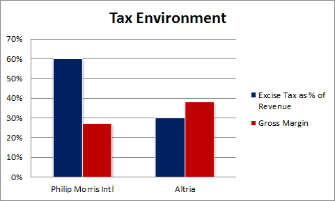 However, Philip Morris' presence in high-tax countries in Western Europe means it brings in less money per dollar of sales than Altria. Philip Morris derives close to 30% of its revenue from the European Union, where excise taxes often make up more than 60% of the price of a cigarette. The average U.S. tax, however, is only 40% of the price of a cigarette. This is why excise taxes make up about 30% of Altria's revenue and it earns a 38% gross margin, while excise taxes make up 60% of Philip Morris' revenue and it earns a 27% gross margin.
