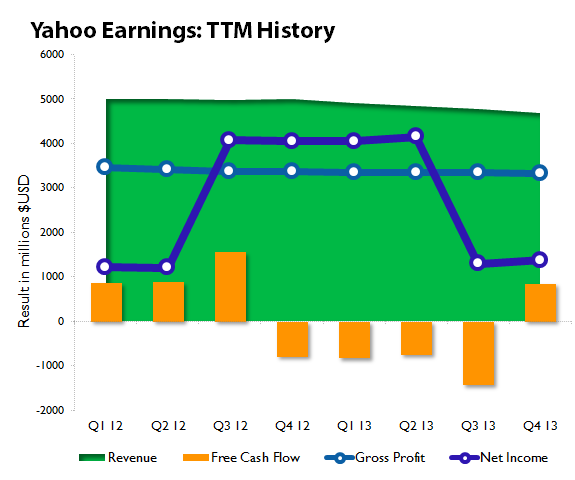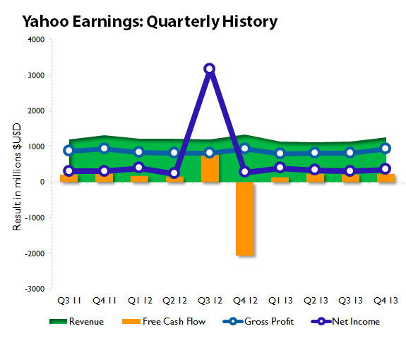Yahoo!'s top line has been in a gradual, but unmistakable, downtrend for some time now, and the company failed to change that in 2013. Excluding the substantial one-time impact of Mayer's sale of some Alibaba assets last year, Yahoo!'s bottom line has made some progress, though it may not be as significant as investors would like. Quarterly net income was 18% higher in the latest report than it was in the same quarter of 2011, but free cash flow was 20% lower in the latest quarter than it was for that period. It's difficult to accurately compare this quarter to 2012 because of the impact of that Alibaba sale, but GAAP net income was 28% higher in the latest quarter than it was in the year-ago quarter, closely in line with the adjusted result headlining Yahoo's report.