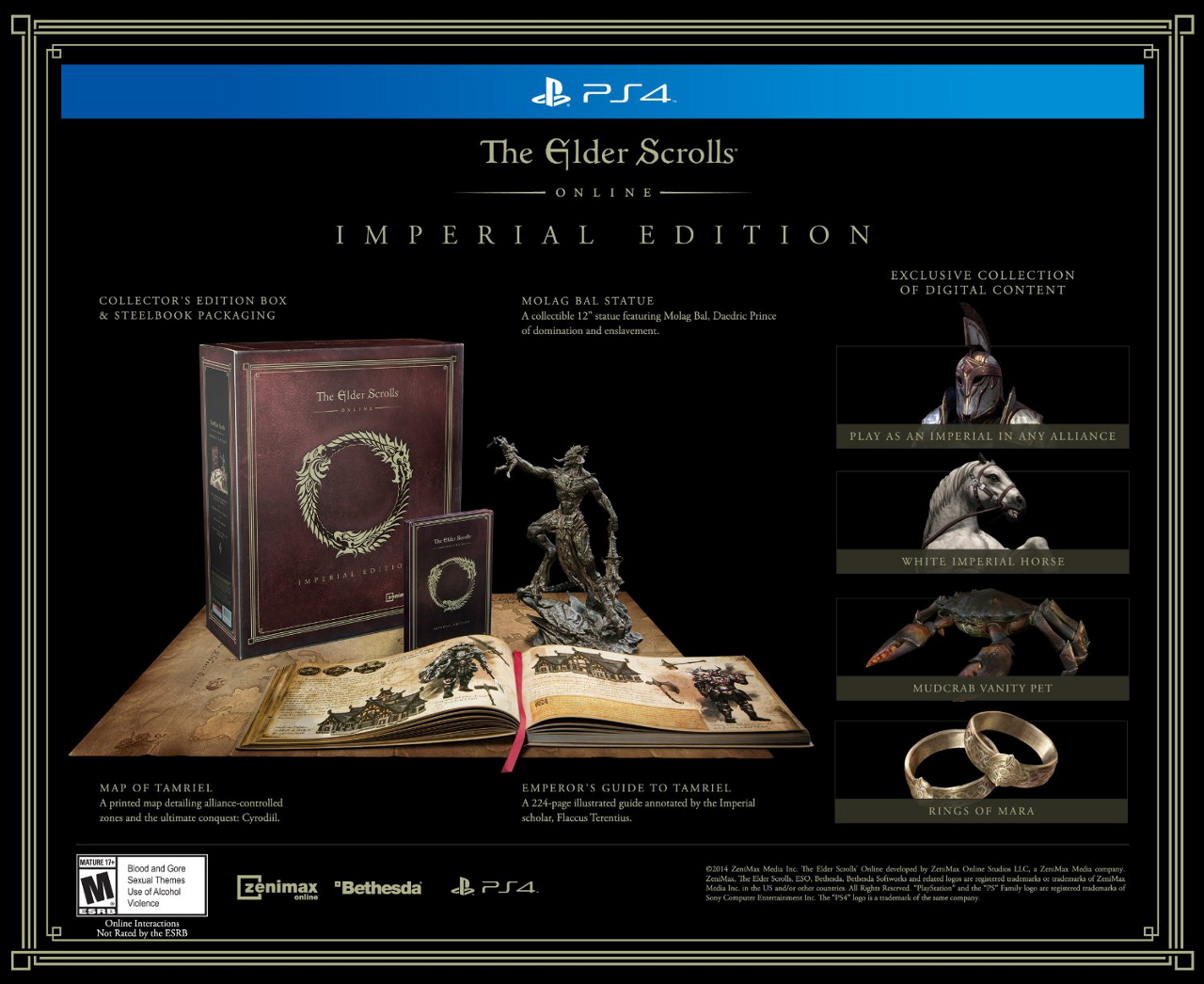 The Elder Scrolls Online: Imperial Edition contains the following physical items: a statue of Molag Bal, the Daedric Prince of domination and enslavement, a 224-page Emperor's Guide to Tamriel, a Map of Tamriel, and a collector's edition box.