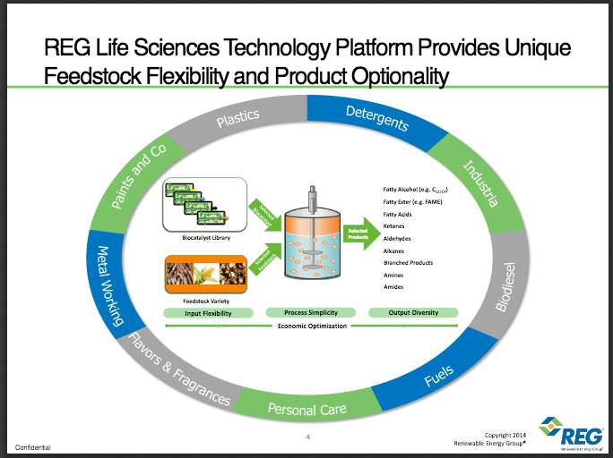 January proved to be a great month for synthetic biology. Startups and industry enthusiasts gave a collective sigh of relief last week when Renewable Energy Group (REGI +0.00%), the nation's largest biodiesel producer, announced the acquisition of struggling LS9 and its head-first dive into industrial biotechnology. The move offers a new growth opportunity for Renewable Energy Group investors and marks the company's entrance into biobased chemicals, which contrast the current offerings of biodiesel, renewable heating oil, and renewable diesel -- all created in simple chemical reactions.