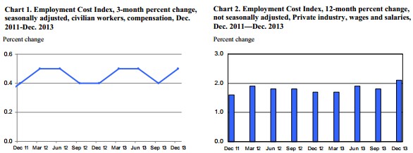 Employment costs (and, thus, employee compensation) were up a seasonally adjusted 0.5% for the fourth quarter of 2013, according to a Labor Department report (link opens as PDF) released today.