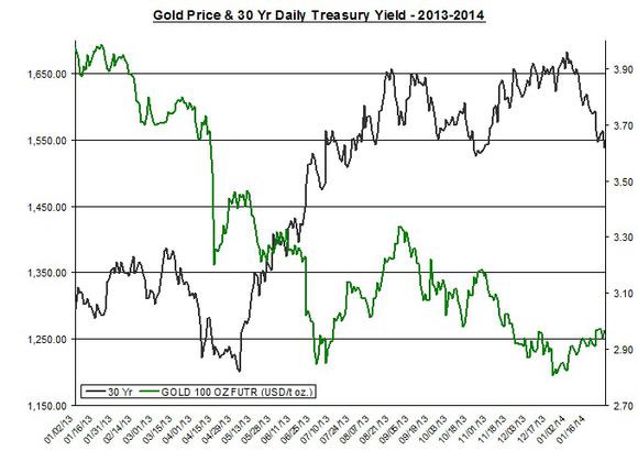 - Market sentiment: Despite the good year equities had in 2013, they have started off 2014 on a negative note. Moreover, the FOMC's decision to continue tapering QE3 didn't stop U.S long-term Treasury yields from falling in recent weeks. The chart below shows the changes in 30-year Treasury yields and the price of gold.