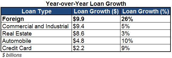 But in fact, its biggest source of loan growth on both a percentage and aggregate basis was foreign loans: