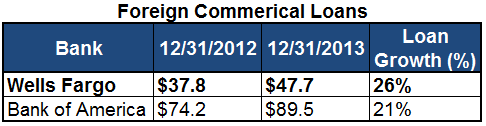 In fact, in its commercial loan portfolio, foreign loans went from being roughly 10.5% of loans at the end of 2012 to 12.5% at the end of 2013. And while Bank of America has a commanding lead in total loans and delivered strong growth, Wells Fargo actually outpaced it: