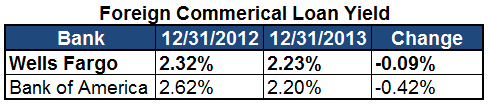 It is also rather interesting Wells Fargo went from trailing Bank of America in the yield earned from commercial loans in the fourth quarter of 2012 by a relatively wide margin, to actually being ahead of it at the end of 2013: