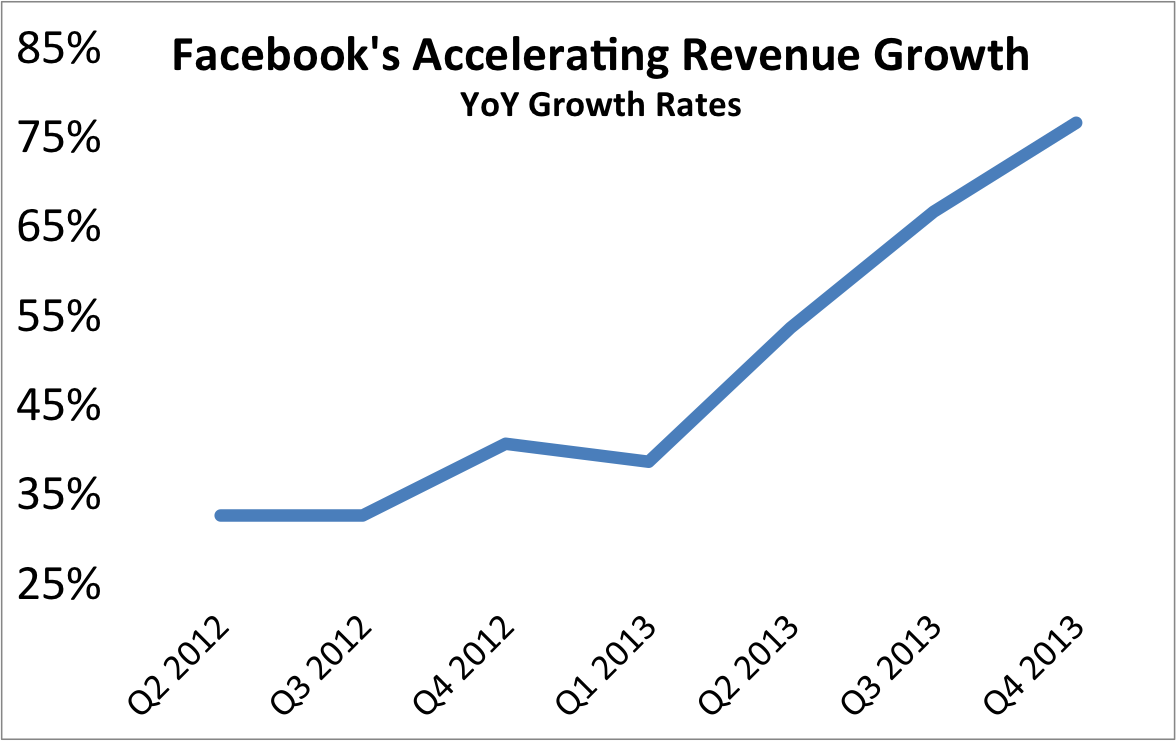 But what happens when a growth stock defies gravity and its revenue growth actually accelerates? For three quarters in a row, this has been the story for Facebook. The company's advertising revenue, which accounts for 90% of the social network's total revenue, is growing at accelerating rates. In fact, these rates are exploding.