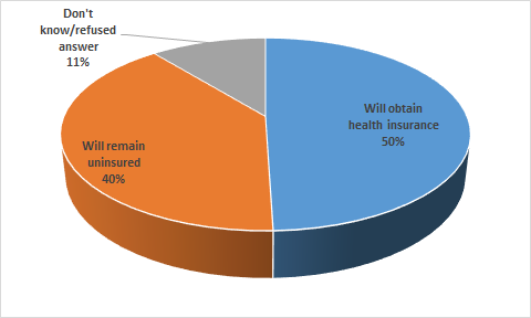 More importantly, half of the uninsured individuals say that they plan to obtain health insurance. On the other hand, a full 40% say they have no intention of gaining coverage. Of those who expressed the desire to become insured, a meager 6% plan to go through HealthCare.gov or a state-operated online exchange.
