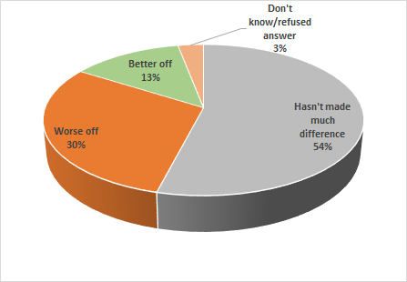 Only 13% of the uninsured think they and their families are better off with Obamacare. That compares with 30% who think they're worse off. The biggest group of respondents (54%), however, stated that the health reform law hasn't made much difference for them so far.