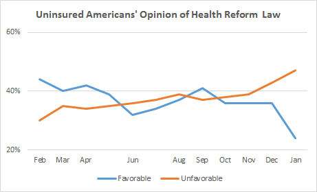 Kaiser surveyed 1,506 adults between Jan. 14 and Jan. 21. While most of the responses were from individuals who had insurance already, a significant number came from uninsured Americans. One of the most stunning findings from the poll related to the precipitous drop in positive opinions about Obamacare among those who don't have insurance currently.