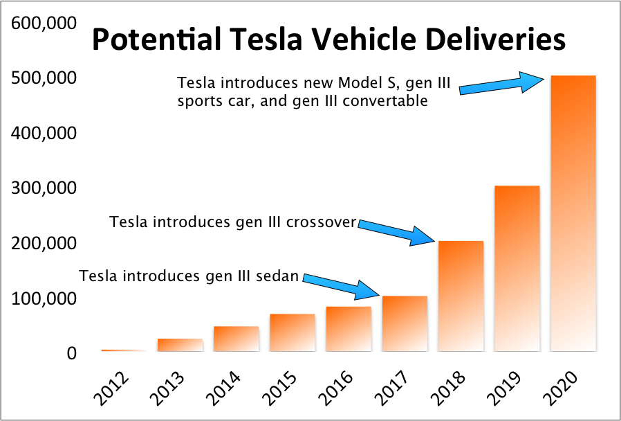 Source: Tesla press releases and comments from management, particularly those of Tesla CEO Elon Musk in a recent interview with Automotive News.