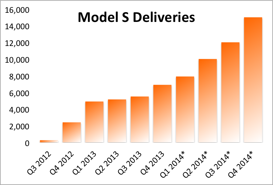* indicates quarterly estimate based on a scenario that doubles global sales in 2014. Source: Tesla press releases