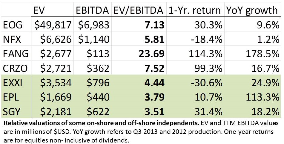 You don't have to look farther than the Gulf of Mexico to verify that research. The table below shows current valuations for seven U.S. independents. Four are onshore and three off. EOG is included as representative of the large cap onshore Indies. High-growth, smaller market cap independents listed include Carrizo Oil and Gas (CRZO +0.00%) and Diamondback Energy (FANG 0.70%), in addition to growth-challenged Newfield Exploration. Offshore operators include the aforementioned Energy XXI (NASDAQ: EXXI), EPL Oil and Gas (NYSE: EPL), and Stone Energy (SGY).
